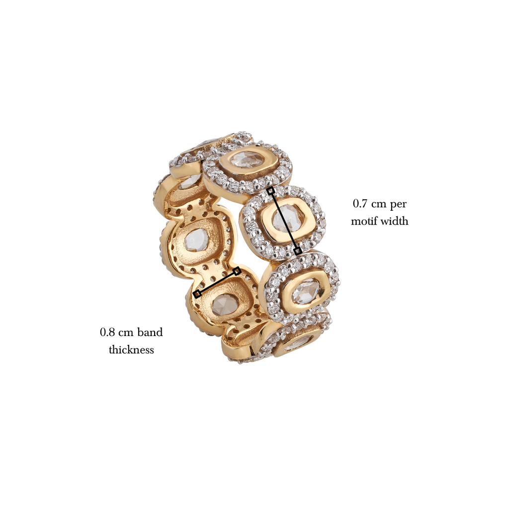 Elevate your stack with our Rose-Cut Diamond Eternity Band—a symbol of endless elegance and sophistication. This exquisite ring features 13 mesmerizing rose-cut diamonds, each surrounded by small round-cut diamonds and meticulously set in gold. The versatile design makes it a perfect eternity band that can be stacked with other bands, allowing you to create a personalized and glamorous statement.