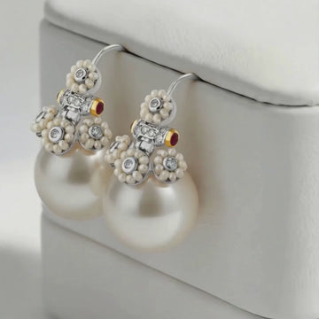 This earring is a study in detail and contrast. A large, lustrous natural pearl drop is crowned by a cap of three intricate "rosettes"—flowers crafted from tiny seed pearls surrounding a central diamond. The top stud mirrors this floral motif, connected by a diamond-encrusted hinge bar. The design is punctuated by two bezel-set Rubies on the sides, adding a passionate pop of red that creates a stunning contrast against the white pearls.