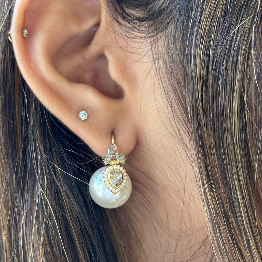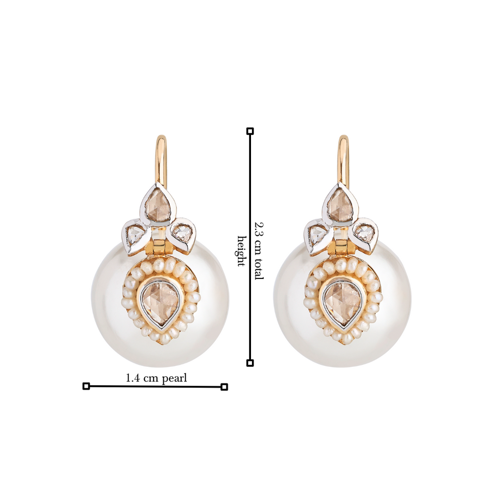 Ethereal, elegant, and undeniably captivating — the Large Rosecut Diamond and Pearl Earrings are crafted for those who appreciate refined drama. Set in 14K gold, each earring showcases a bold yet airy silhouette adorned with rosecut diamonds that shimmer with a soft, vintage-inspired glow. A lustrous pearl drop completes the look, adding timeless grace and fluidity.