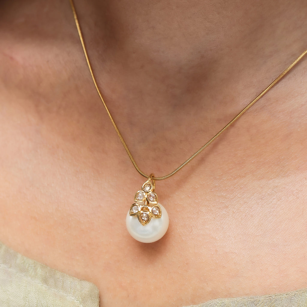 Inspired by the gentle elegance of a flower in full bloom, the 6-Petal Rosecut Diamond and Pearl Pendant is a soft yet striking statement in everyday luxury. Crafted in gold, the pendant features six delicately shaped petals, each set with glistening rosecut diamonds that offer a subtle, vintage-inspired glow. At its centre, a radiant natural pearl anchors the design with timeless grace.