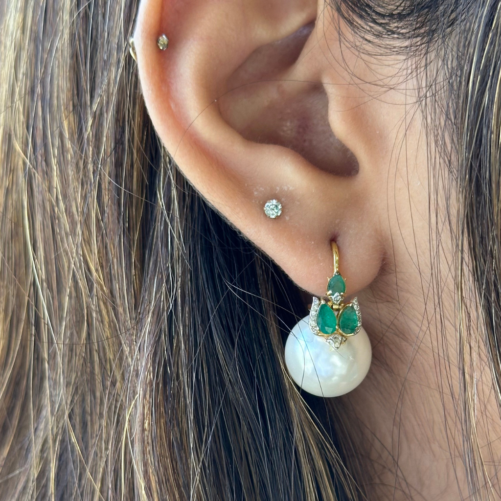 A vibrant expression of balance and beauty — the 3 Emerald Diamond and Pearl Earrings bring together colour, clarity, and timeless form. Set in 14K gold, each earring features a trio of vivid emeralds arranged in harmony, accented with natural diamonds for soft sparkle. A single pearl drop adds a final touch of grace, creating a silhouette that’s both refined and radiant.