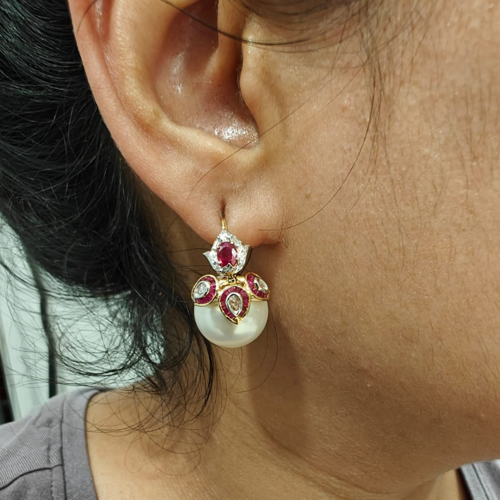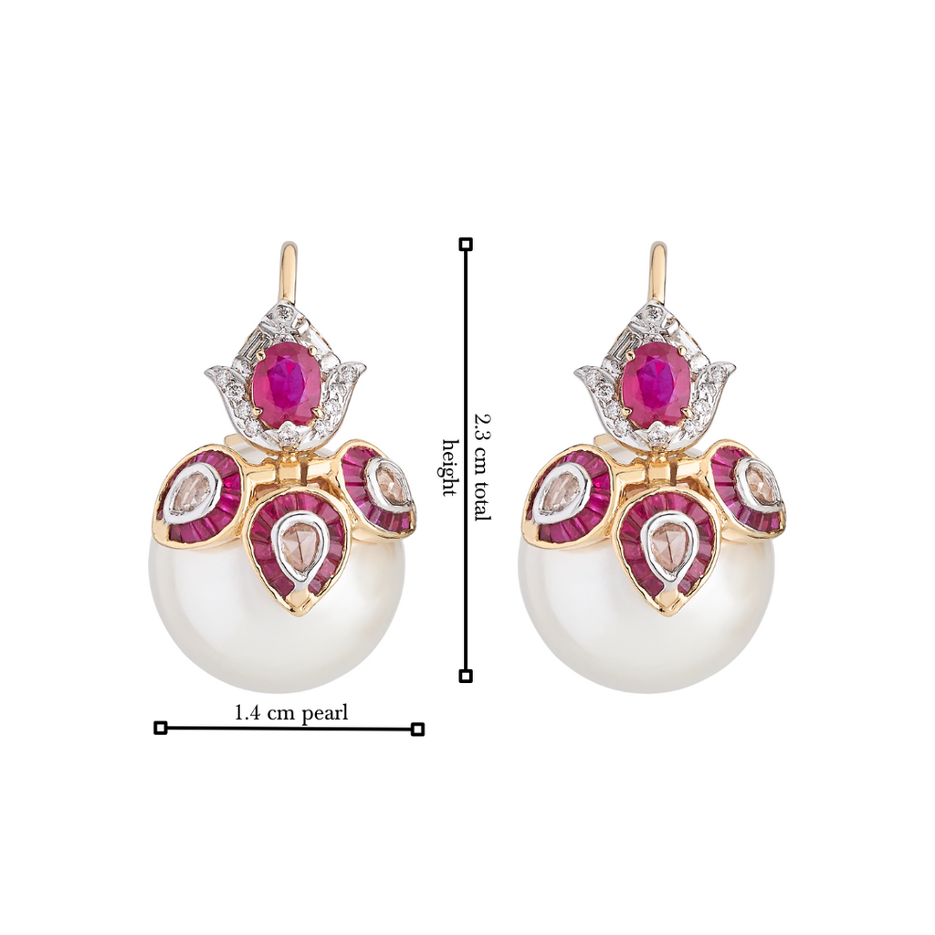Striking yet graceful, the 3-Petal Large Ruby, Diamond and Pearl Earrings are a bold take on floral elegance. Crafted in 14K gold, each earring features a generous three-petal silhouette, richly adorned with vibrant rubies and sparkling natural diamonds. A lustrous pearl drop completes the design, adding softness and timeless charm to this regal statement piece.