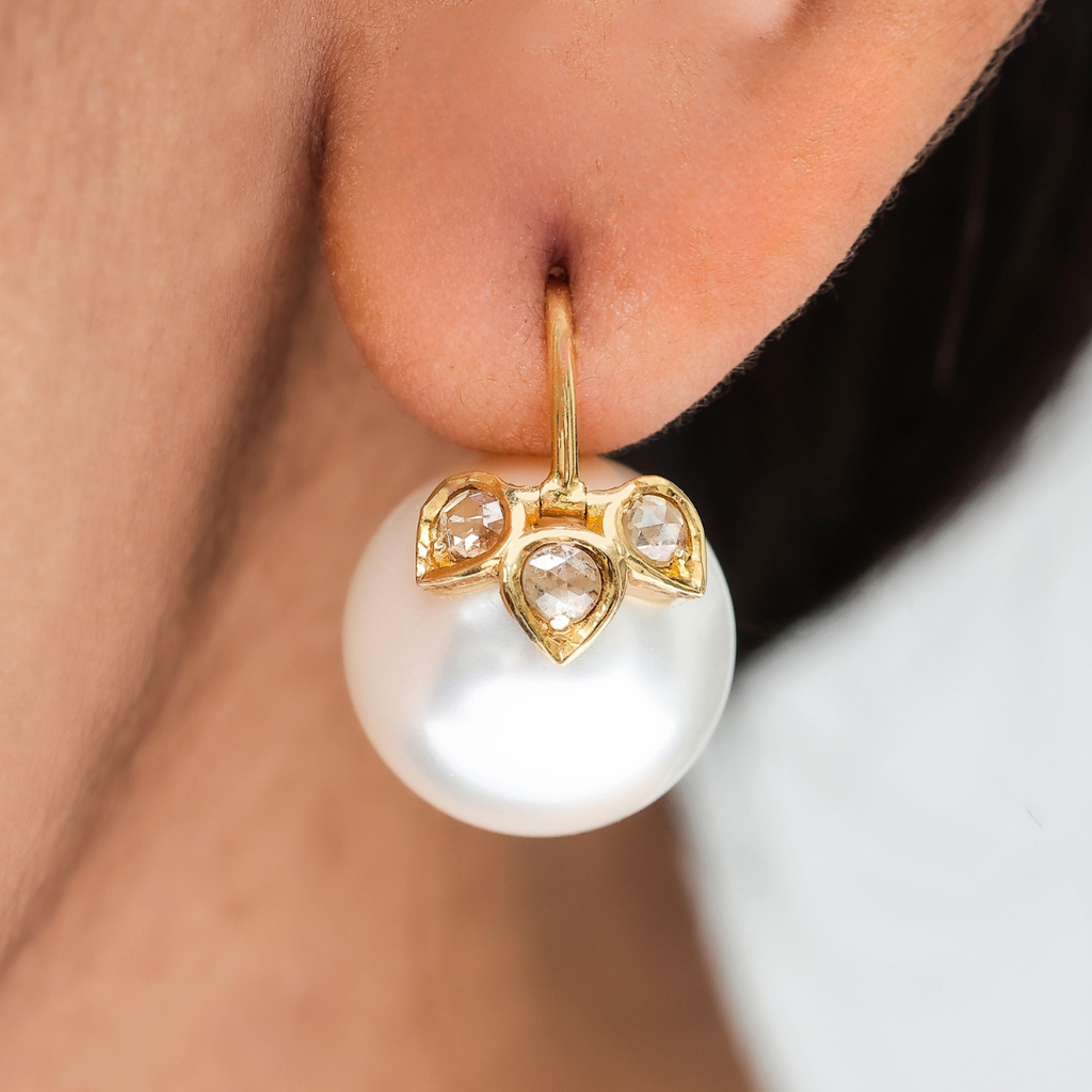Delicate and dreamy, the 3-Petal Rosecut Diamond and Pearl Earrings blend vintage charm with contemporary minimalism. Crafted in gold, each earring features three soft, petal-like forms adorned with rosecut diamonds — their subtle shimmer evoking old-world romance. At the centre lies a radiant natural pearl, adding a gentle glow that completes the design.
