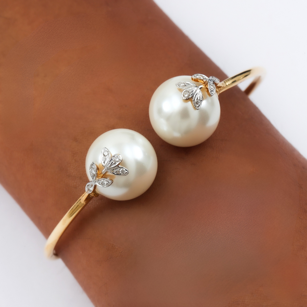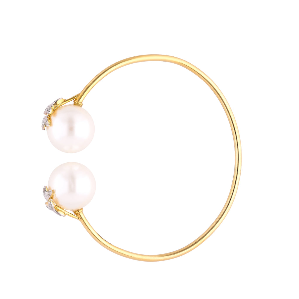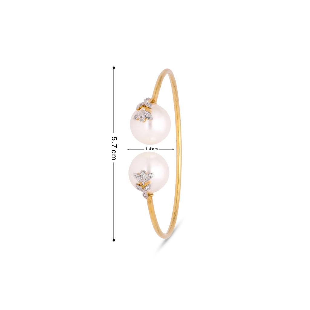 A sculptural ode to floral symmetry — the Classic 6-Petal Diamond and Pearl Bangle brings soft femininity and modern elegance together in a seamless form. At its centre blooms a radiant flower crafted in gold, with six diamond-encrusted petals embracing a luminous pearl.