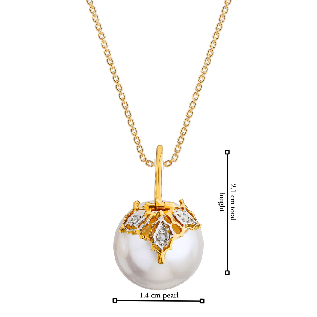 A whisper of tradition with a modern soul — the Filigree Diamond and Pearl Pendant brings the elegance of lace-like goldwork into a piece that’s effortlessly wearable. Crafted in 14K gold, its intricate filigree pattern is accented with natural diamonds that lend a soft sparkle. At the centre rests a luminous pearl, adding a timeless touch of grace.