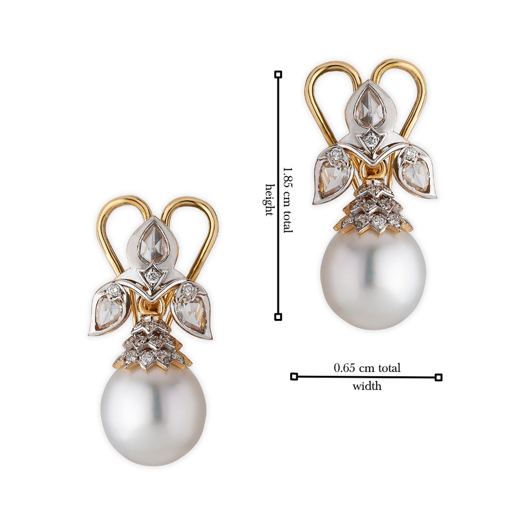 Experience the epitome of sophistication with our vintage rose-cut earrings with pearls. This exquisite pair showcases three large rose-cut diamonds forming a timeless motif, elegantly culminating with a lustrous Taiwanese Pearl at the bottom. Meticulously crafted using gold, these earrings combine the allure of classic design with the opulence of a South Sea Pearl for a truly captivating accessory.