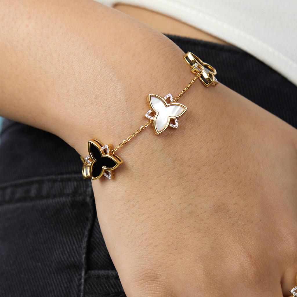 Classic Combination: The bracelet combines the timeless beauty of mother of pearl and the mystique of onyx trilliums, creating a striking and versatile piece.