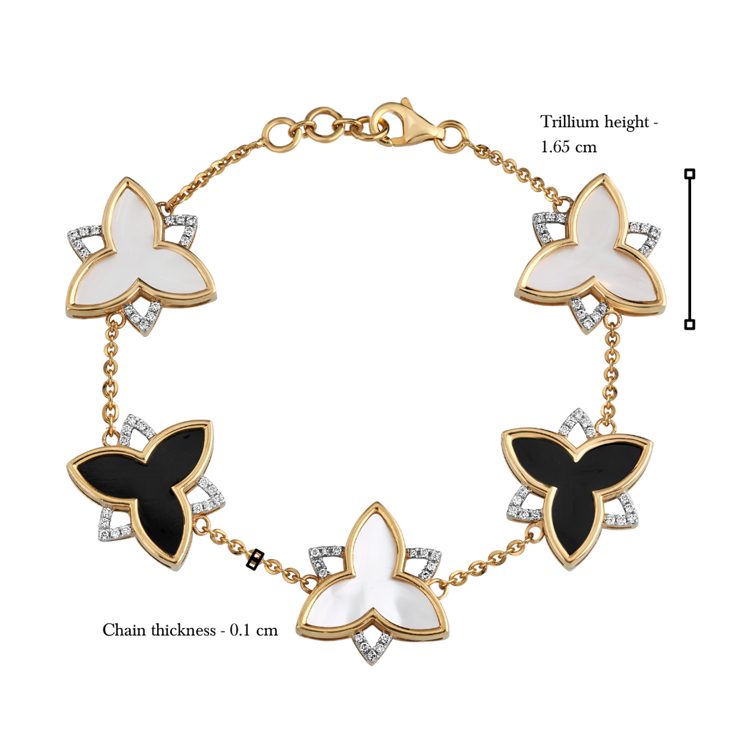 Elevate your style with our Trillium Mother of Pearl and Onyx Bracelet—a classic masterpiece meticulously crafted to make a statement. This bracelet features a timeless combination of mother-of-pearl and onyx trilliums, symbolizing strength for the modern woman. With five trilliums elegantly arranged, it's a versatile accessory that can be paired with a watch or worn on its own. Whether for everyday wear, special occasions, or travel, this bracelet is the epitome of modern elegance.